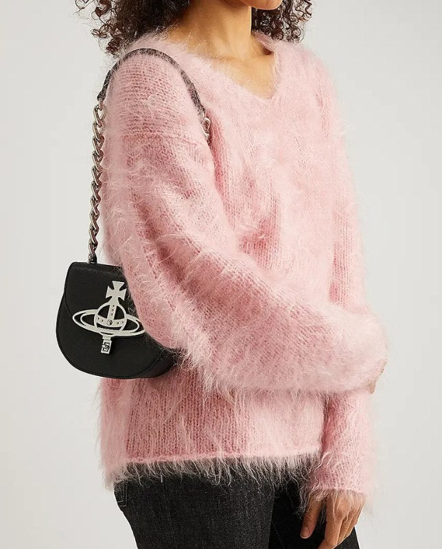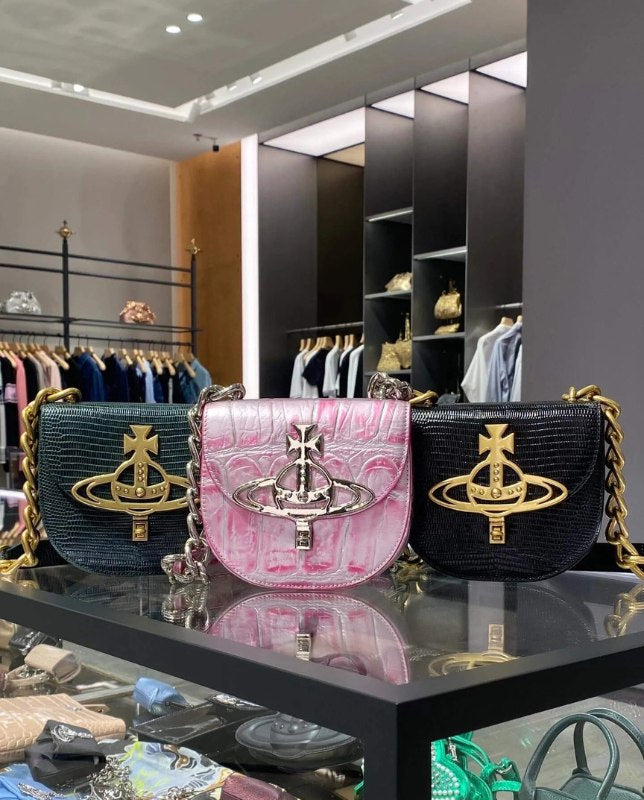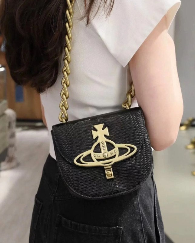 Make a bold style statement with this eye-catching saddle bag, crafted from vegan leather in a colorful tartan pattern. The chunky chain strap and oversized emblem add an edgy twist to its playful design.